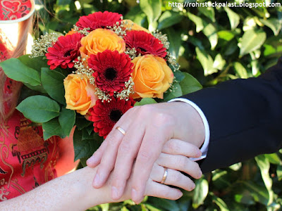 I didn't wear a white wedding dress, either. First of all, I don't see why I should spend so much money on a dress which I only wear once in my life. Second, white is a colour that doesn't suit me. And third, wearing a white wedding dress (the colour of innocence) simply would have been a lie! :-) So, I wore my Chinese wedding dress which harmonized wonderfully with the bridal bouquet in warm colours that Ludwig had chosen. Ludwig wore an elegant suit and looked very handsome.